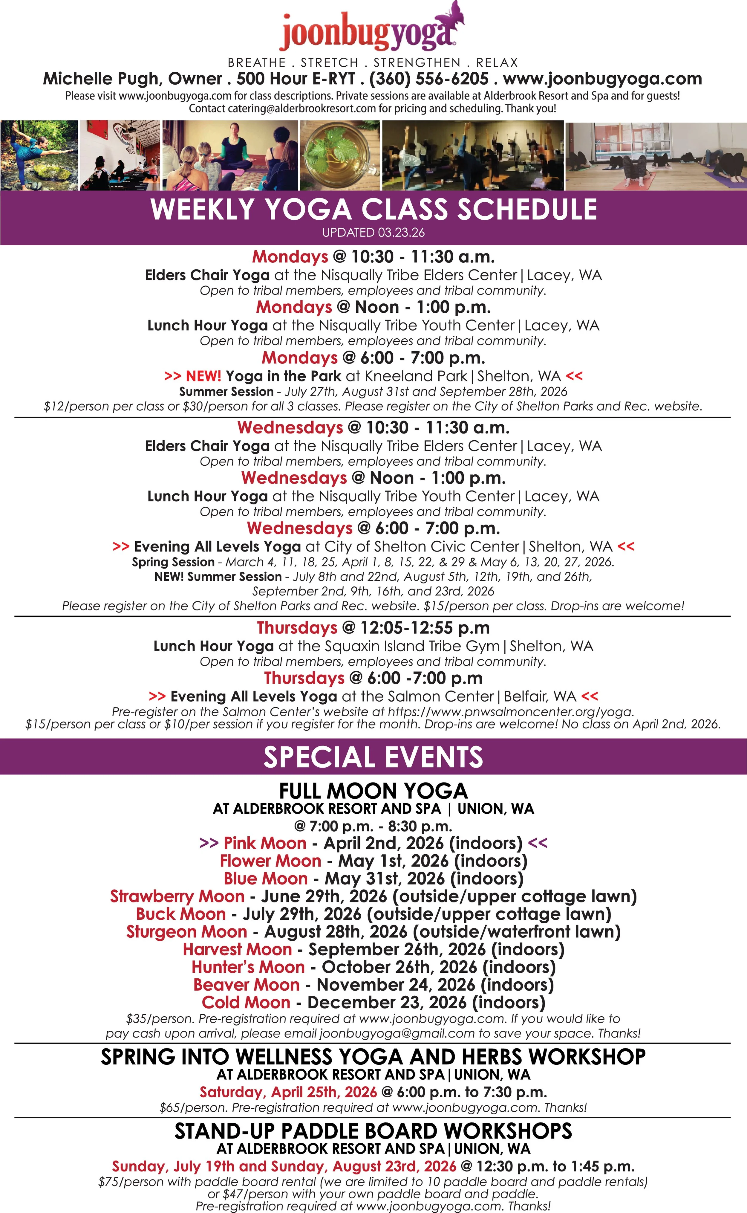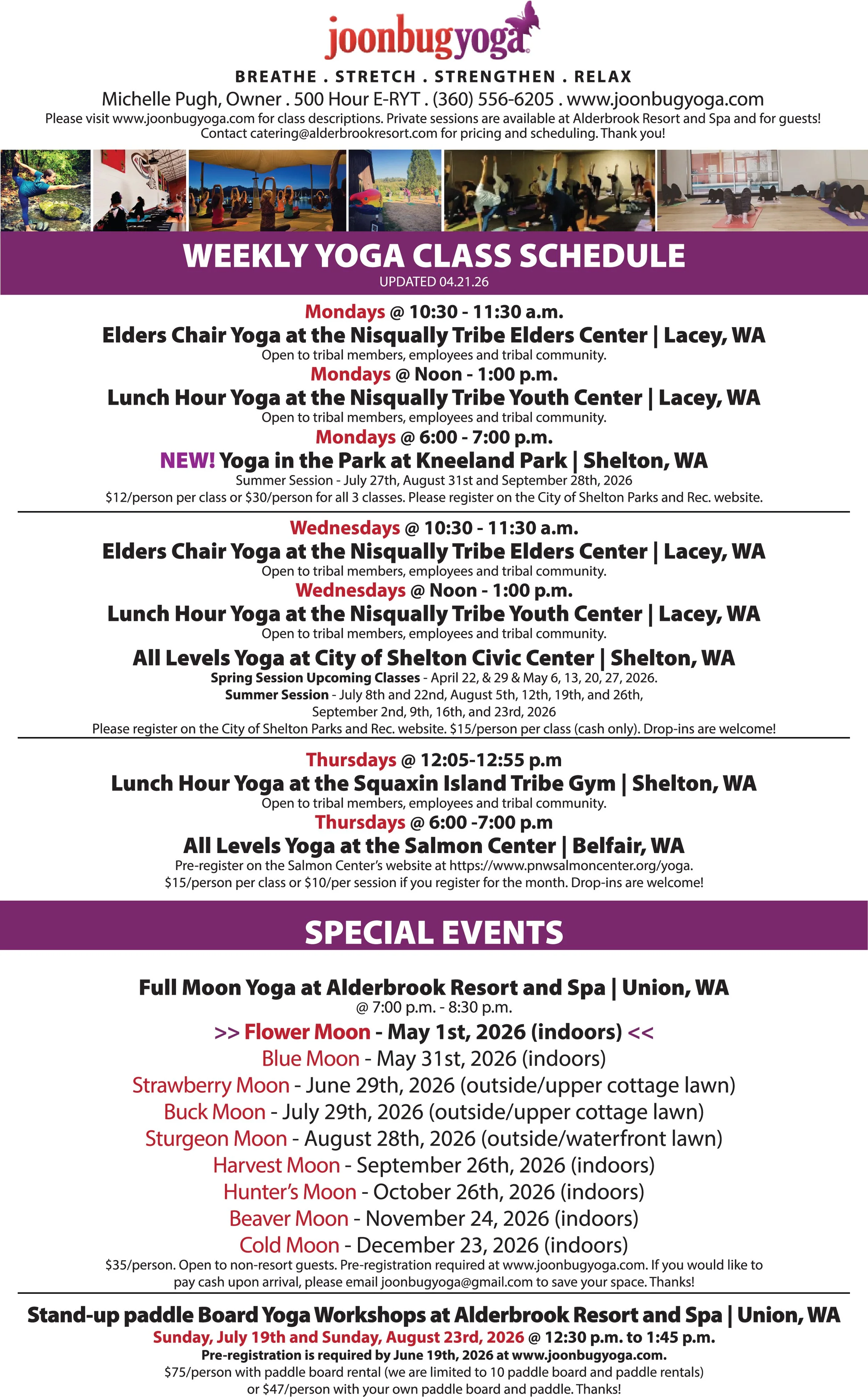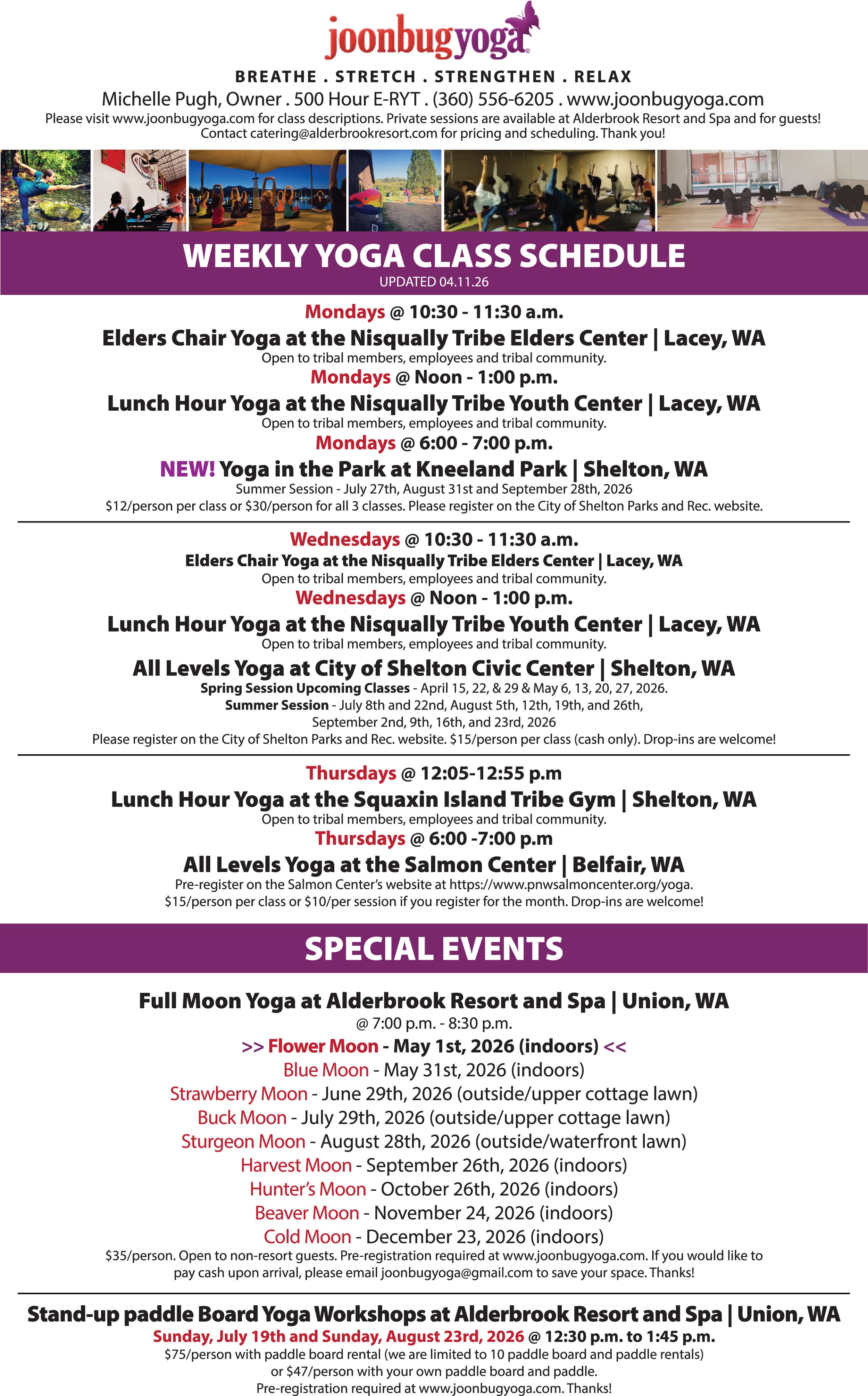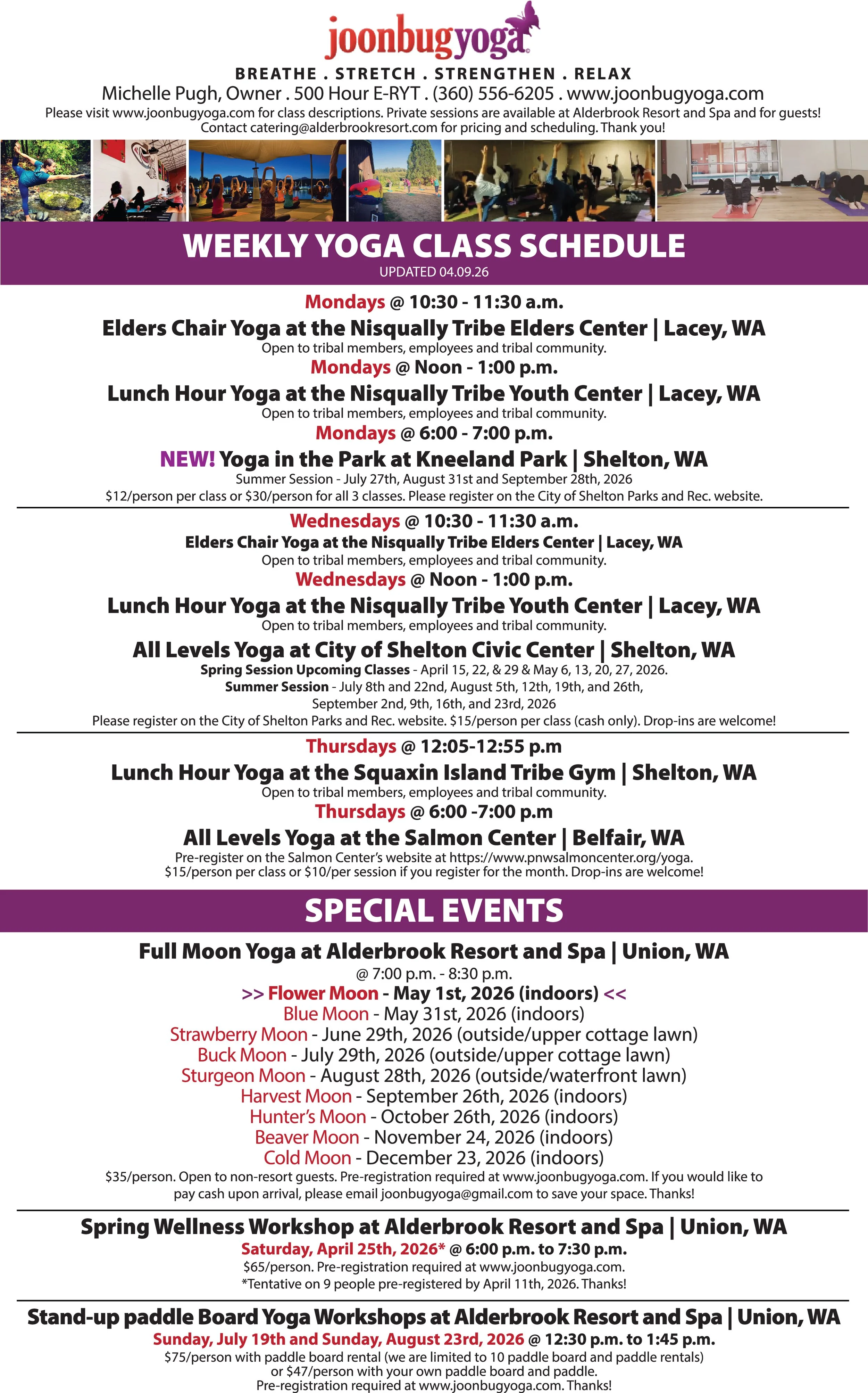 Special events, workshops and retreats are available throughout the year. Please contact Michelle for more information at joonbugyoga@gmail.com or (360) 556-6205.