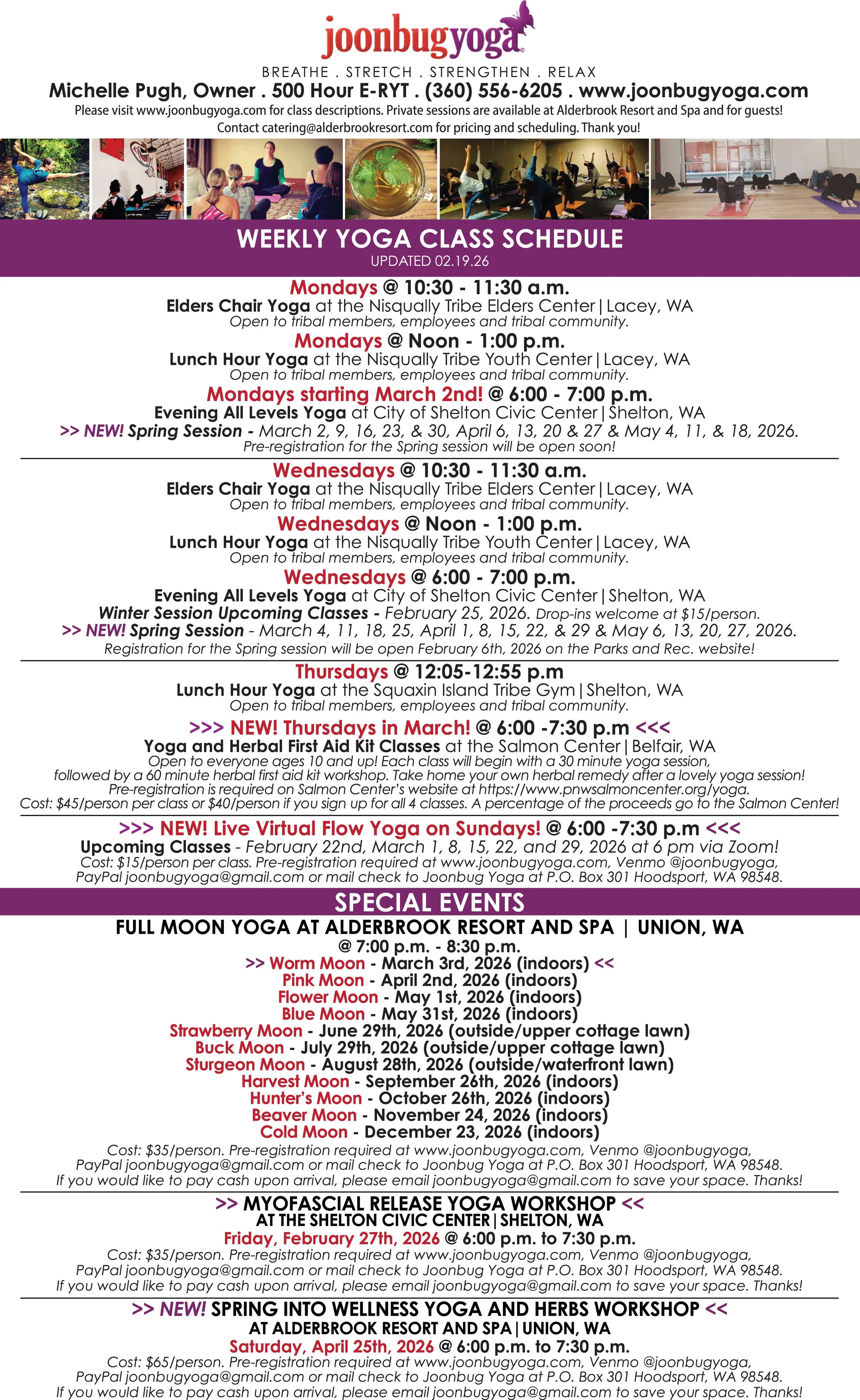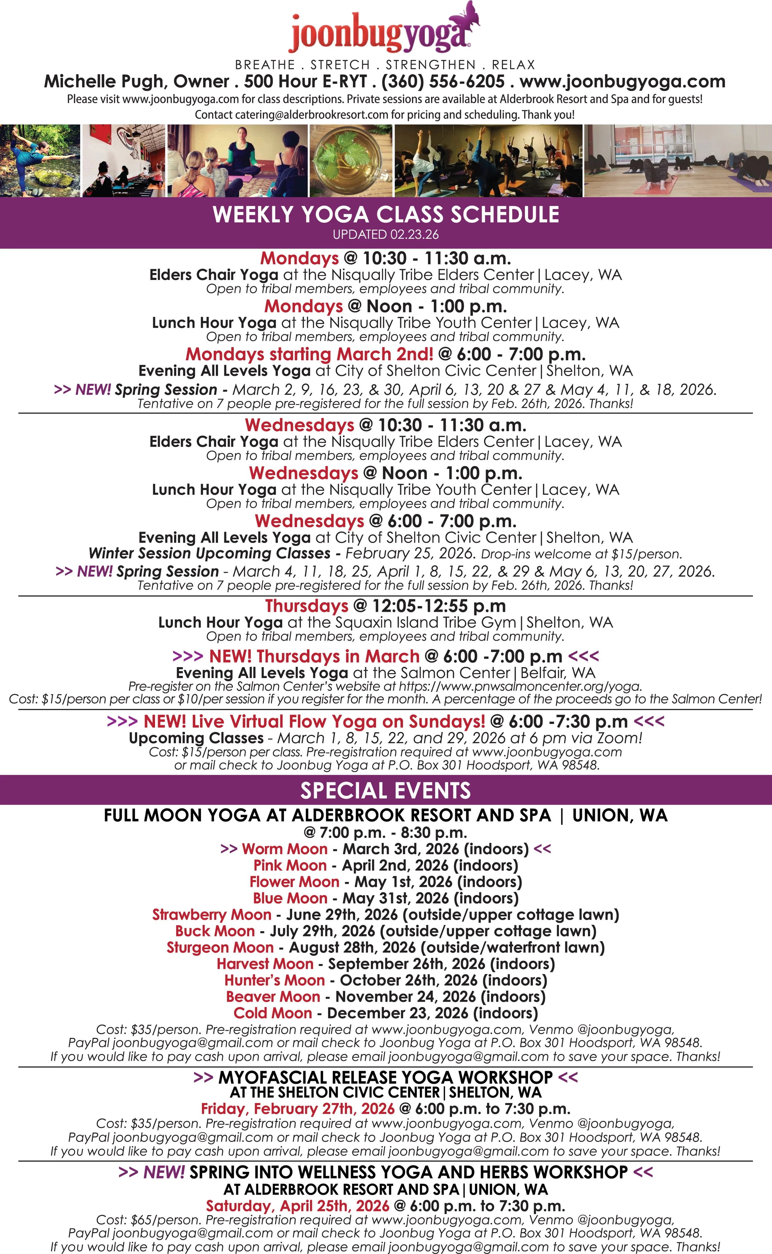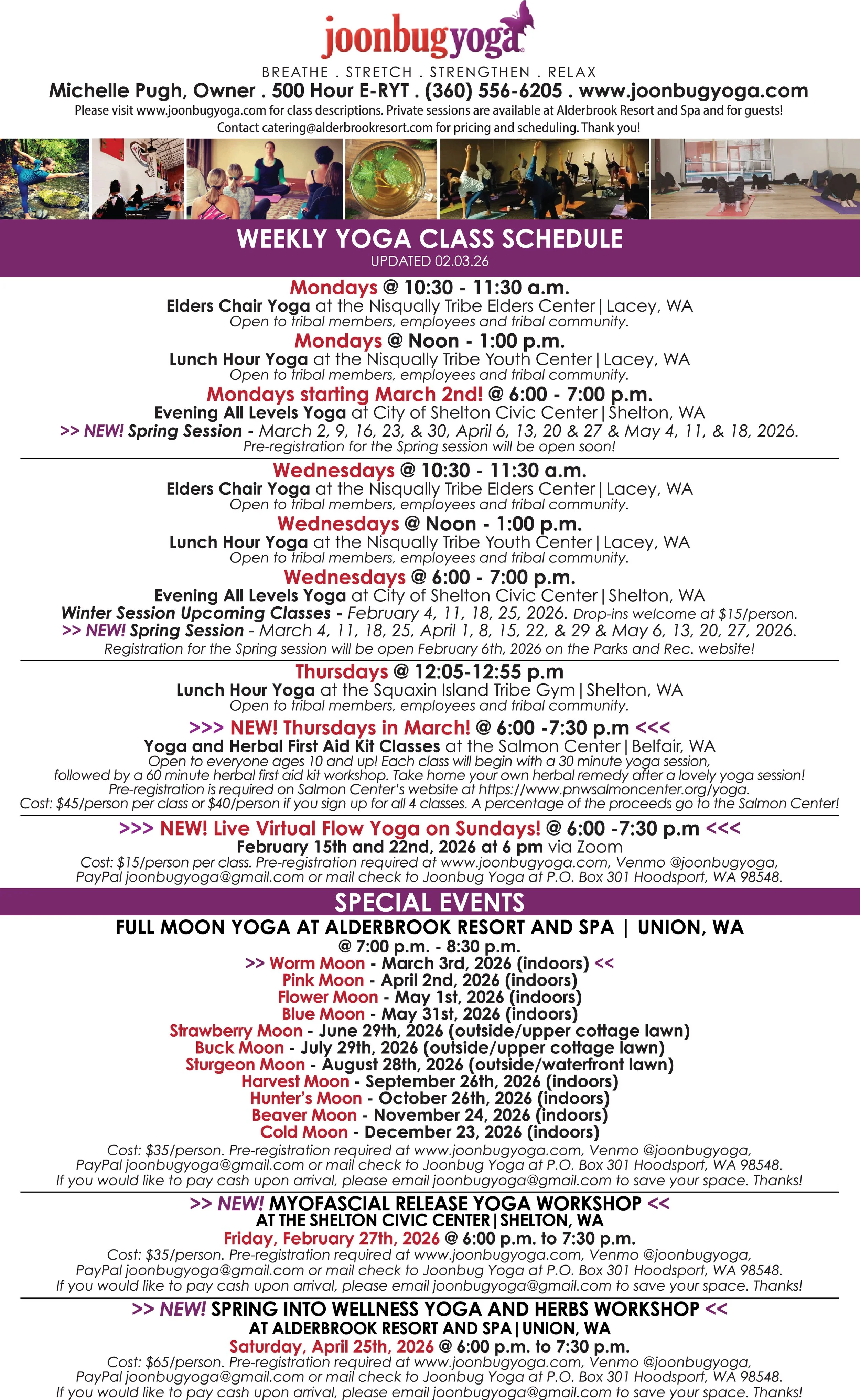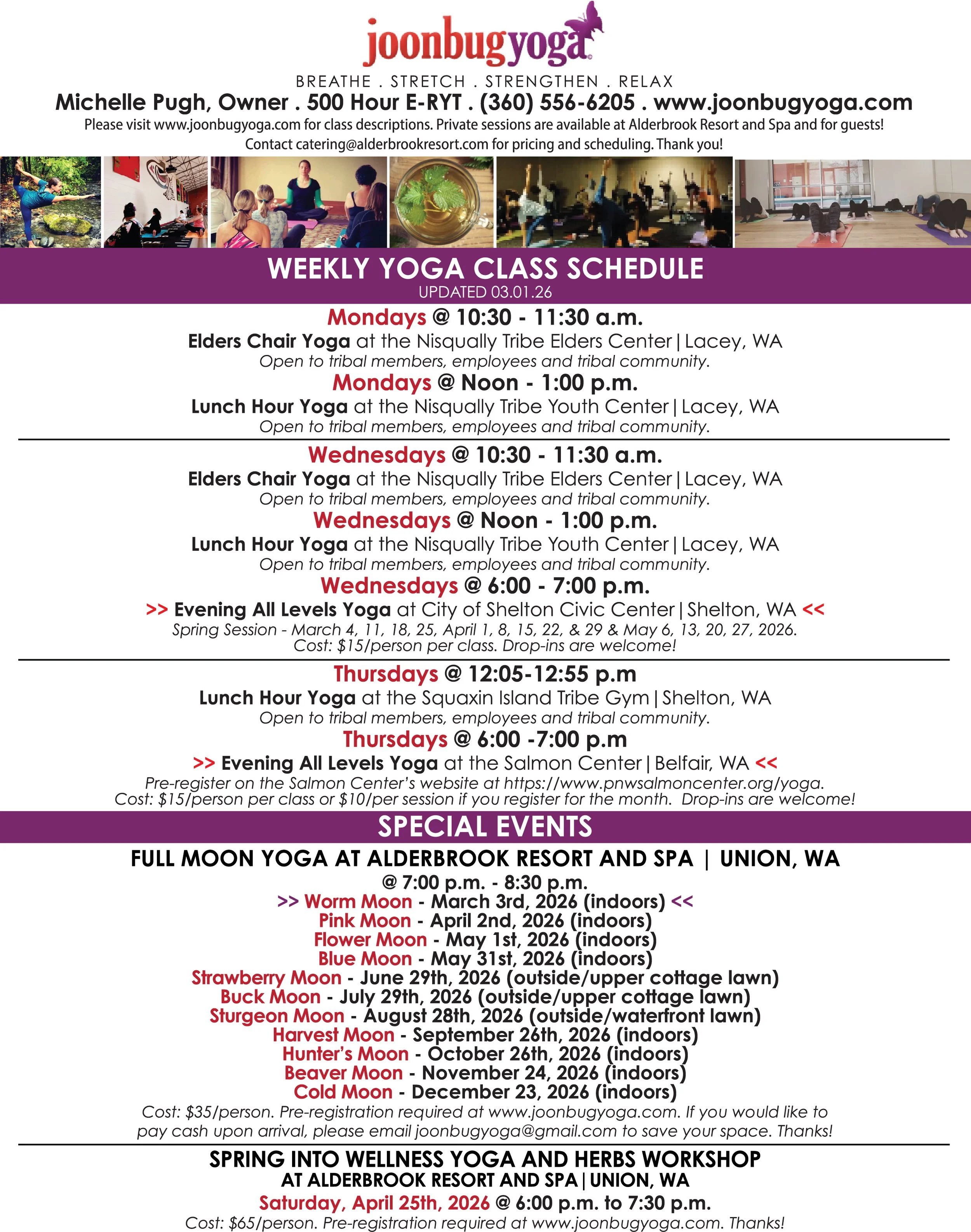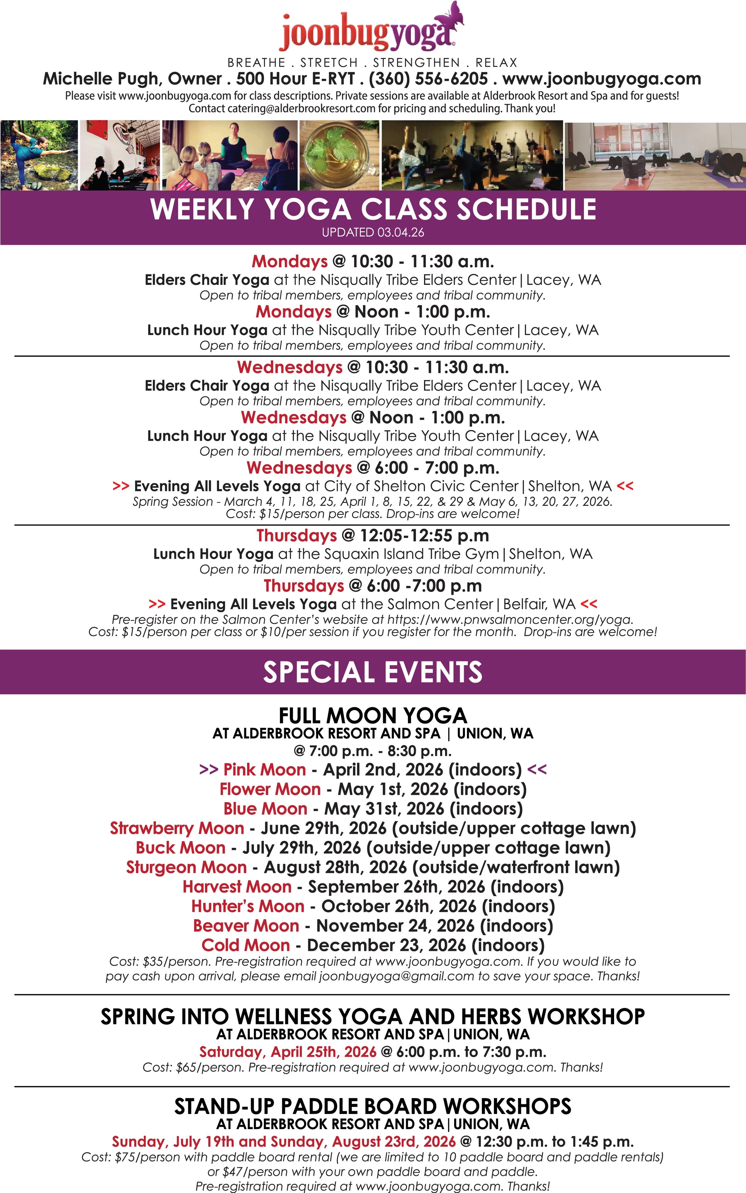 Special events, workshops and retreats are available throughout the year. Please contact Michelle for more information at joonbugyoga@gmail.com or (360) 556-6205.